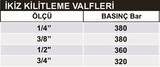 İkiz kilitleme valfleri, çift etkili hidrolik silindirlerin A ve B hatlarına bağlanarak her iki yönde de kontrolsüz hareketi engelleyen emniyet elemanlarıdır. Yük altında oluşabilecek hortum patlaması, valf kaçakları veya ani basınç düşüşleri durumunda silindirin konumunu korur. Pilot basınç ile açılarak sadece istenen yönde ve kontrollü hareket edilmesine izin verir.Bu valfler vinç sistemleri, platformlar, presler, iş makineleri ve yük tutma gerektiren tüm hidrolik uygulamalarda yaygın olarak kullanılır. Yüksek basınca dayanıklı gövde yapısı, hassas pilot kontrolü ve güvenilir sızdırmazlık özellikleri sayesinde hem sistem güvenliğini hem de operatör emniyetini artırır. Farklı debi ve basınç kapasitelerine sahip modelleri ile çeşitli hidrolik sistemlere kolayca uyum sağlar.