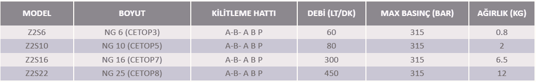 Modüler kilit valfleri, Z2S serisine ait olup modüler plaka tipinde tasarlanmış pilot kumandalı çek valf yapısına sahiptir. Bu valfler, hidrolik sistemlerde hatları güvenli bir şekilde kapatarak akışın geri dönüşünü engellemek için kullanılır. Makine duruşlarında, yük altında bekleme anlarında veya sistemin boşta kaldığı dönemlerde bile tek hat ya da çift hat üzerinde etkin bir kilitleme sağlar ve hidrolik silindirler gibi aktüatörlerin konumlarını korur.Z2S valflerinin açılma mekanizması, karşı hat üzerinden gelen pilot basıncı ile gerçekleştirilir. Pilot hattından iletilen bu basınç sinyali, valfin kontrol pistonu üzerinde etki ederek kilidi çözer ve akışın yeniden ilerlemesine izin verir. Bu yapı sayesinde valf, harici bir kontrol ünitesine gerek duymadan kendi içinde bağımsız bir çalışma fonksiyonuna sahiptir.Dayanıklı yapısı, hızlı tepki karakteri ve modüler plaka tasarımının sağladığı kolay montaj özellikleri ile Z2S kilit valfleri; pres hatlarından vinç sistemlerine, plastik enjeksiyon makinelerinden hidrolik silindir devrelerine kadar birçok endüstriyel uygulamada güvenli ve kararlı çalışma için tercih edilmektedir.